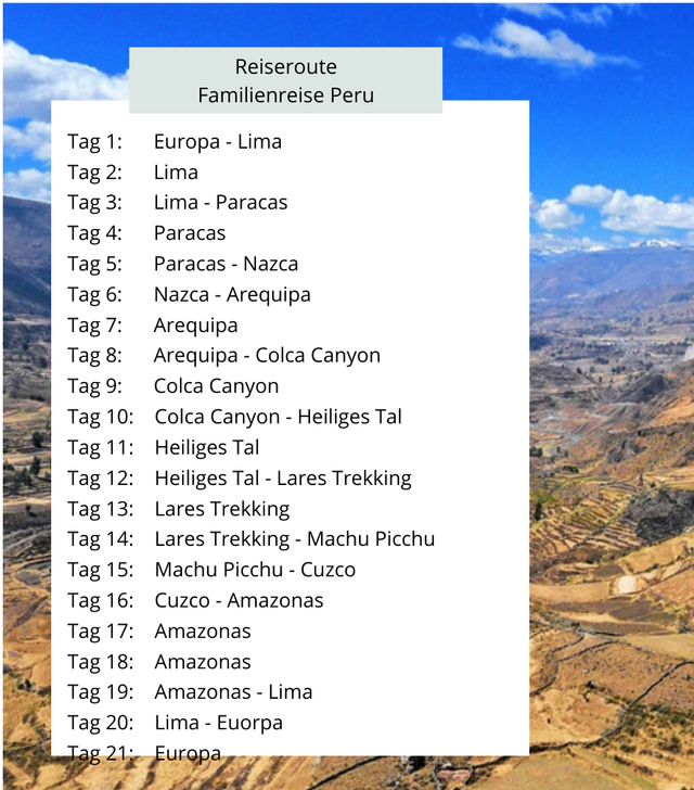 Heute geht Ihre einzigartige Reise leider zu Ende. Sie werden in Ihrem Hotel abgeholt und zum Flughafen von Lima gebracht, wo Sie Ihren internationalen Flug nach Europa antreten.
